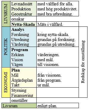 Livsrummet innehåller Levnadssätt, Produktion och Geostruktur (utbredning). Där uppstår Nytta och Skada. Politiken kan göra Analys och formulera Program. På den grunden utarbetas en Ekonomisk Plan och genom dess åtgärder av Styrning och Finansiering ställs Livsrummet om. Politik och Ekonomi är Redskap för omställning av Livsrummet.